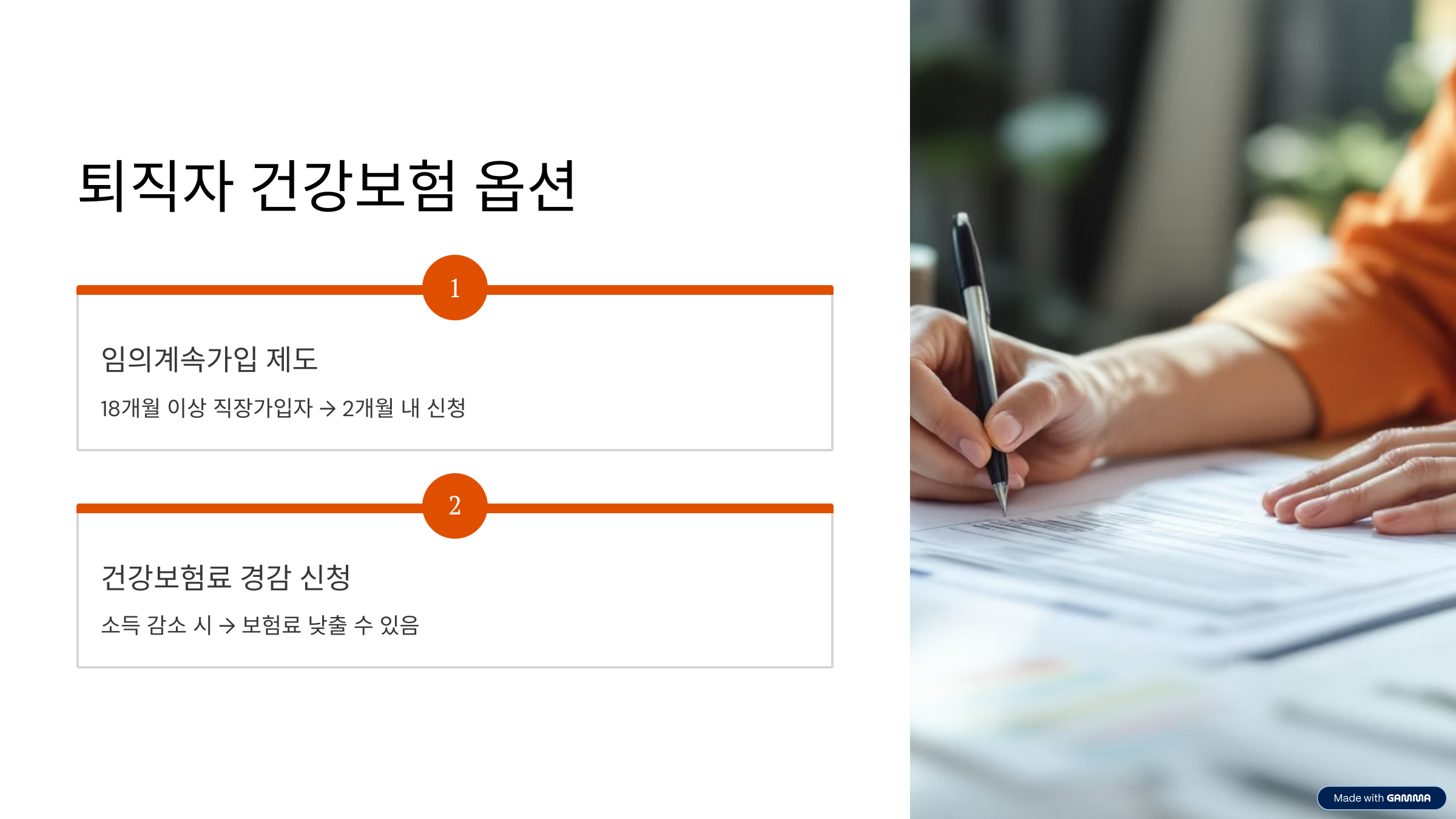 - 퇴직일로부터 2개월 이내에 신청해야 하며, 건강보험료 전액 본인 부담으로 납부합니다.