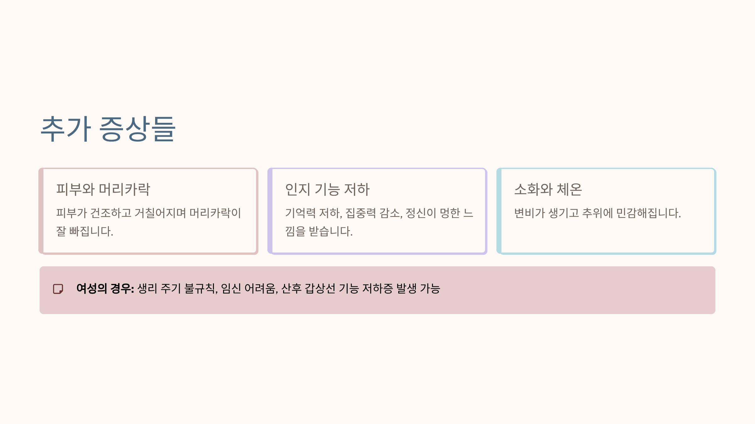 - 변비와 추위 민감 — 대사속도가 느려지면서 장 운동이 둔해지고, 쉽게 추위를 느낍니다.