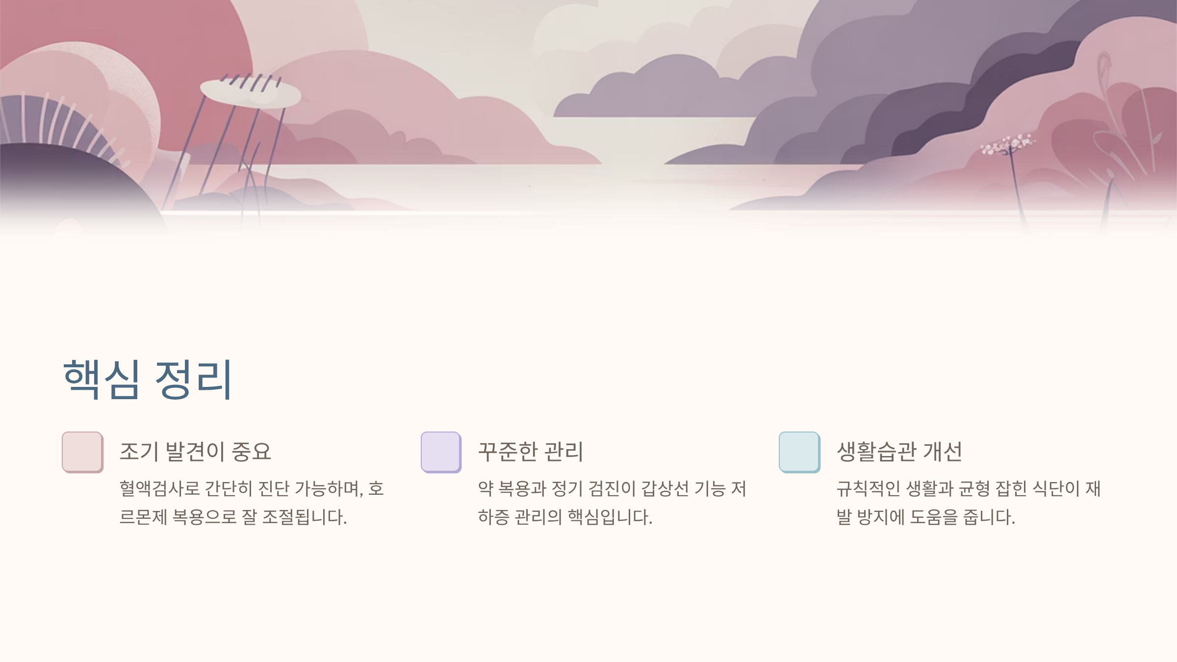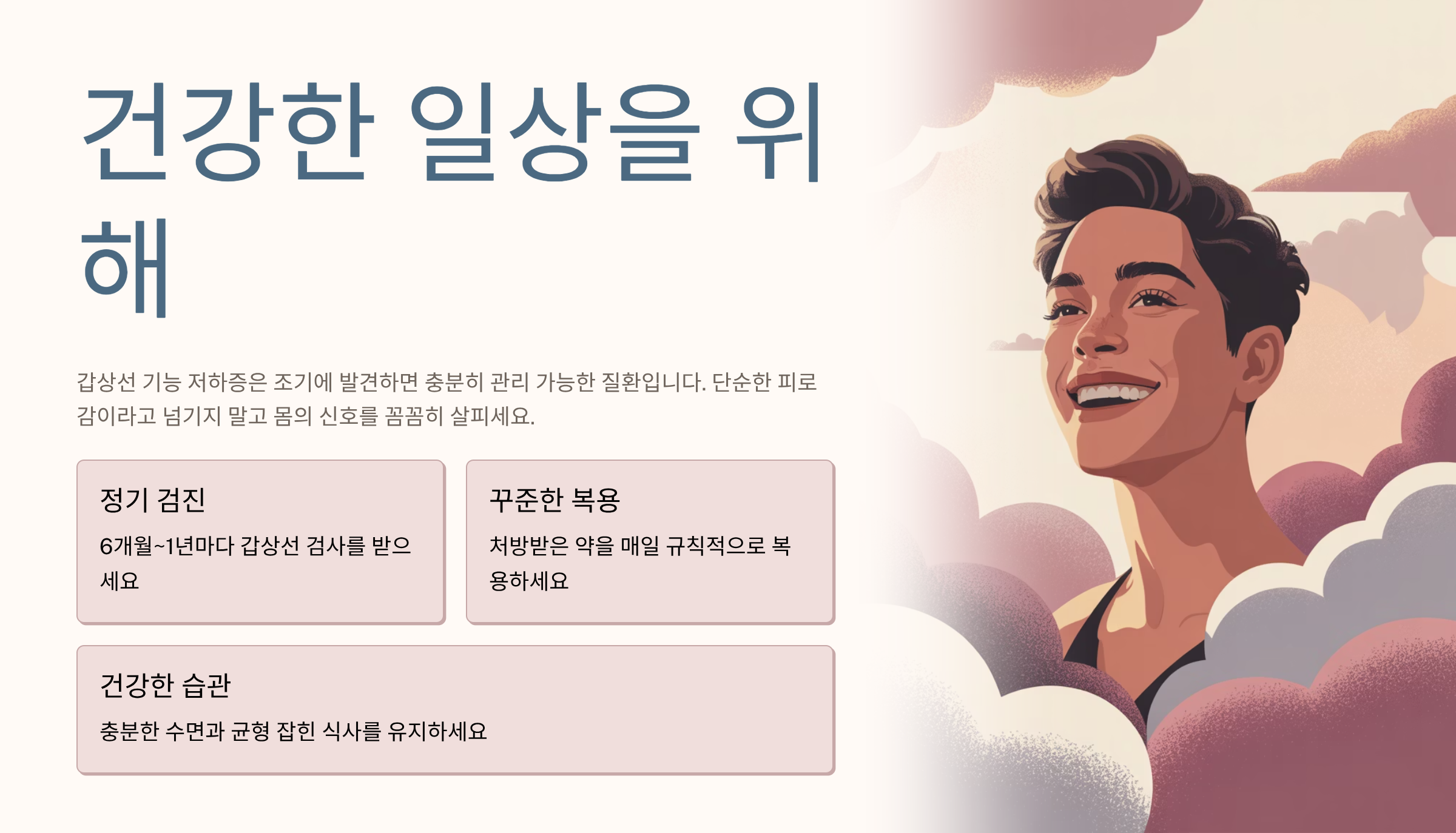 - 꾸준한 약 복용과 정기 검진이 갑상선 기능 저하증 관리의 핵심입니다.