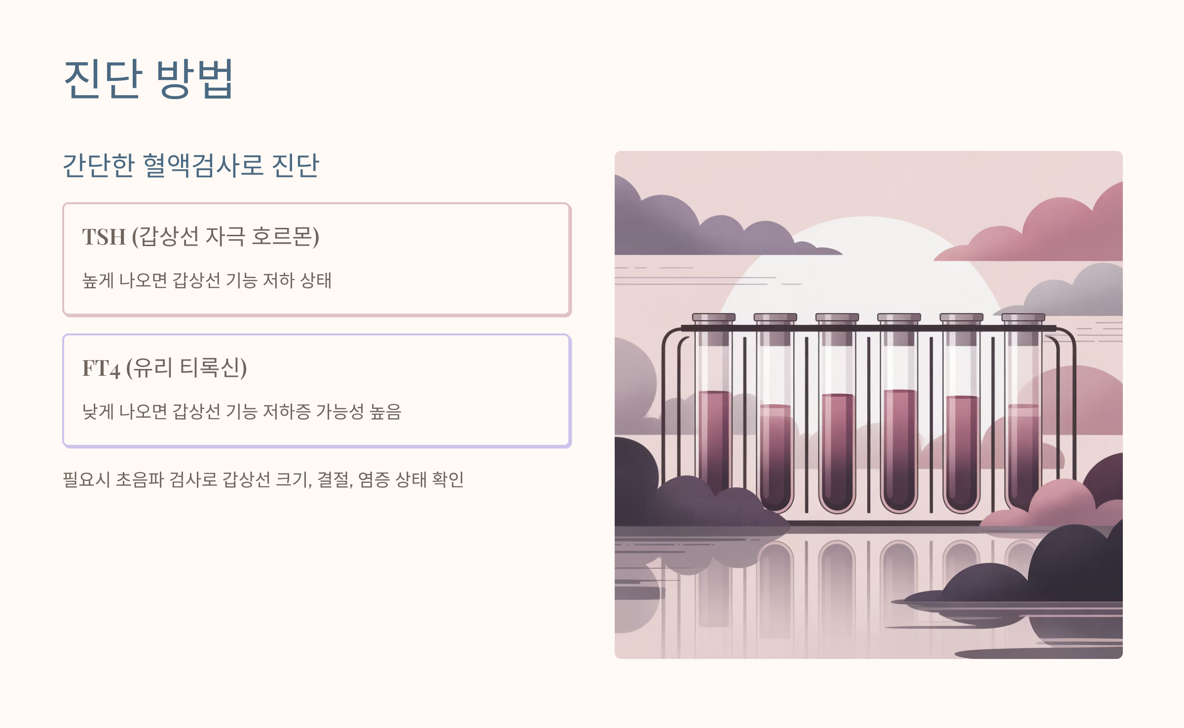 갑상선 기능 저하증은 간단한 혈액검사로 진단할 수 있습니다. 병원에서는 두 가지 주요 수치를 확인합니다.