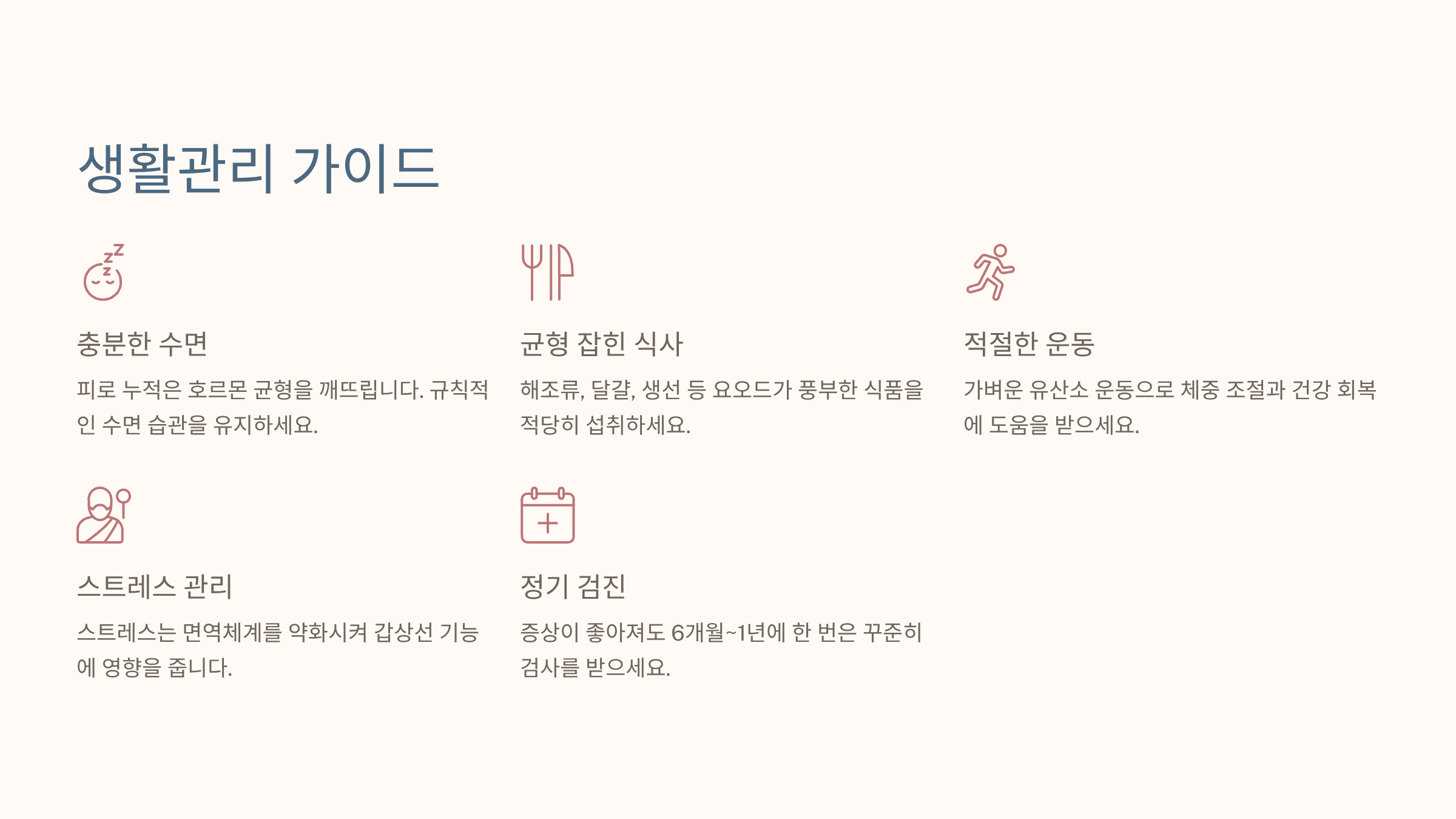 • 정기 검진 — 증상이 좋아져도 6개월~1년에 한 번은 갑상선 기능 저하증 검사를 꾸준히 받으세요.