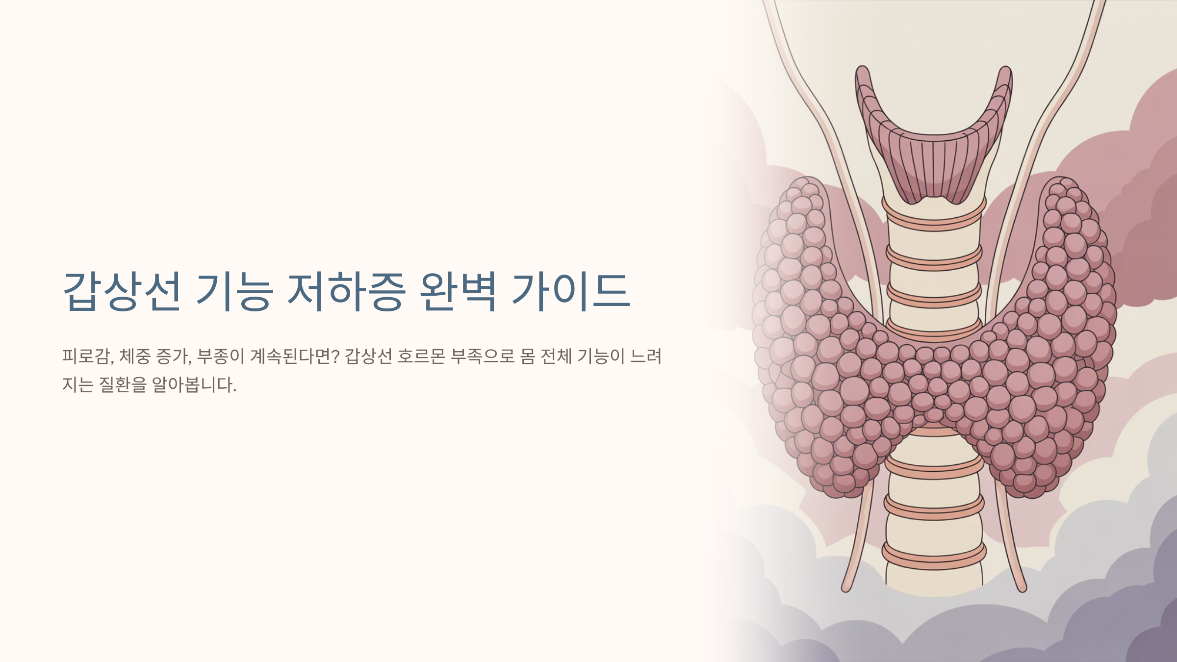 요즘 피곤함이 계속되고, 몸이 붓거나 살이 잘 빠지지 않으신가요? 이런 증상이 있다면 갑상선 기능 저하증을 의심해볼 수 있습니다. 갑상선 기능 저하증은 우리 몸의 대사 속도를 조절하는 갑상선 호르몬이 정상보다 적게 분비되어 몸 전체 기능이 느려지는 질환이에요. 오늘은 갑상선 기능 저하증의 원인, 증상, 진단과 치료, 그리고 일상에서 관리하는 방법까지 하나씩 알려드릴게요.