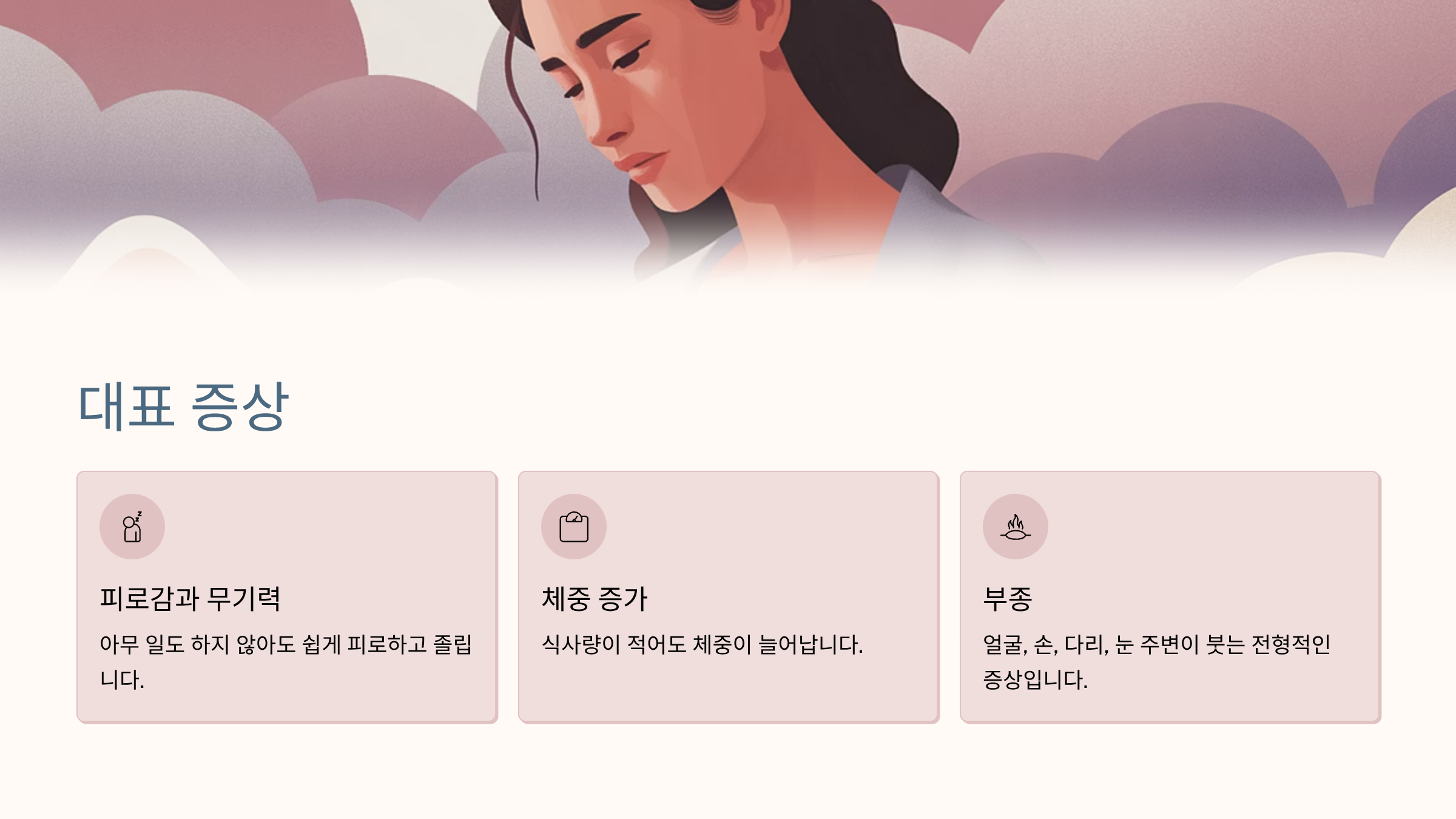 • 피로감, 체중 증가, 부종, 추위 민감 등 다양한 증상이 나타납니다.