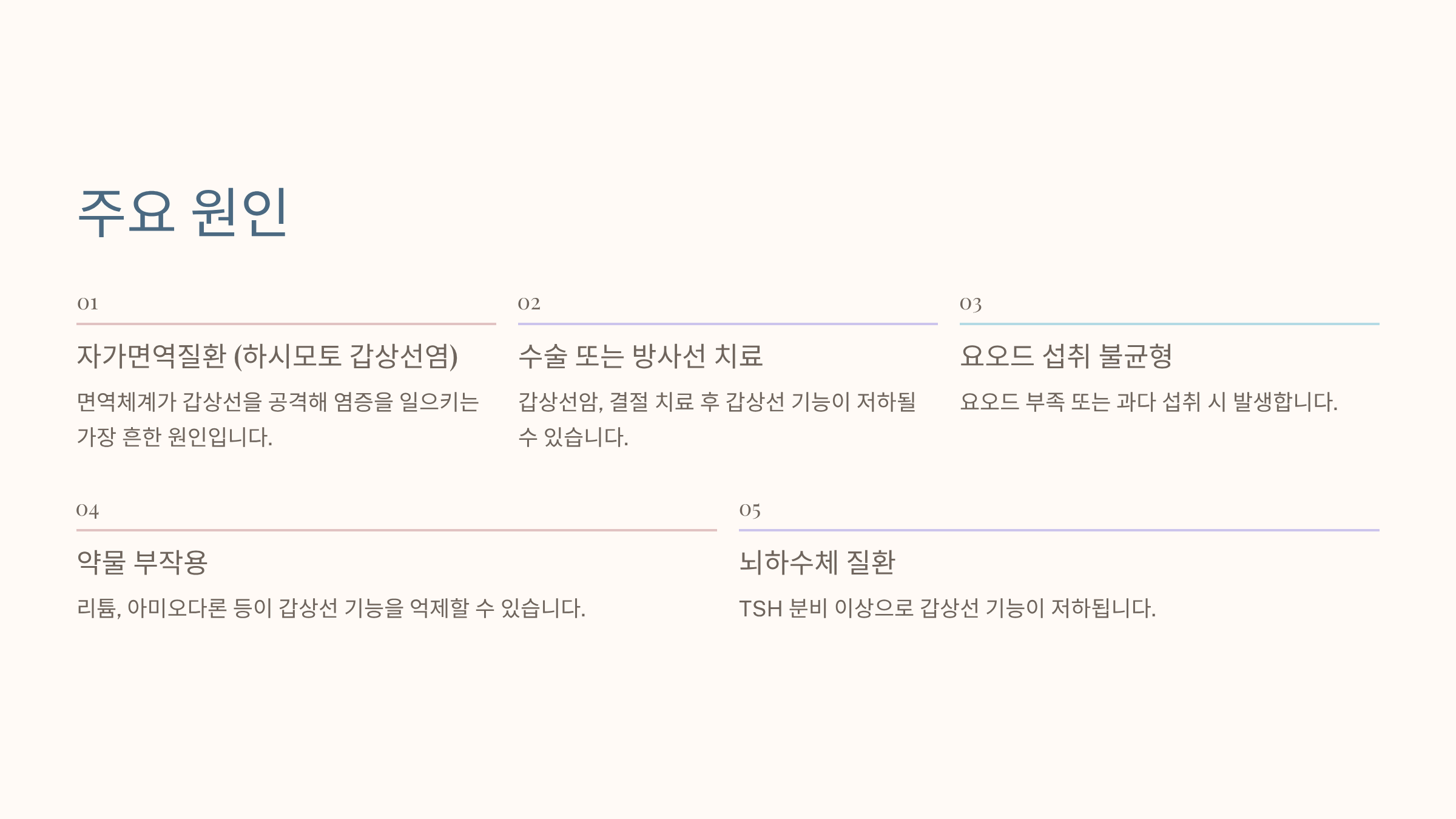 갑상선 기능 저하증은 다양한 원인으로 생깁니다. 대표적인 원인은 다음과 같습니다.