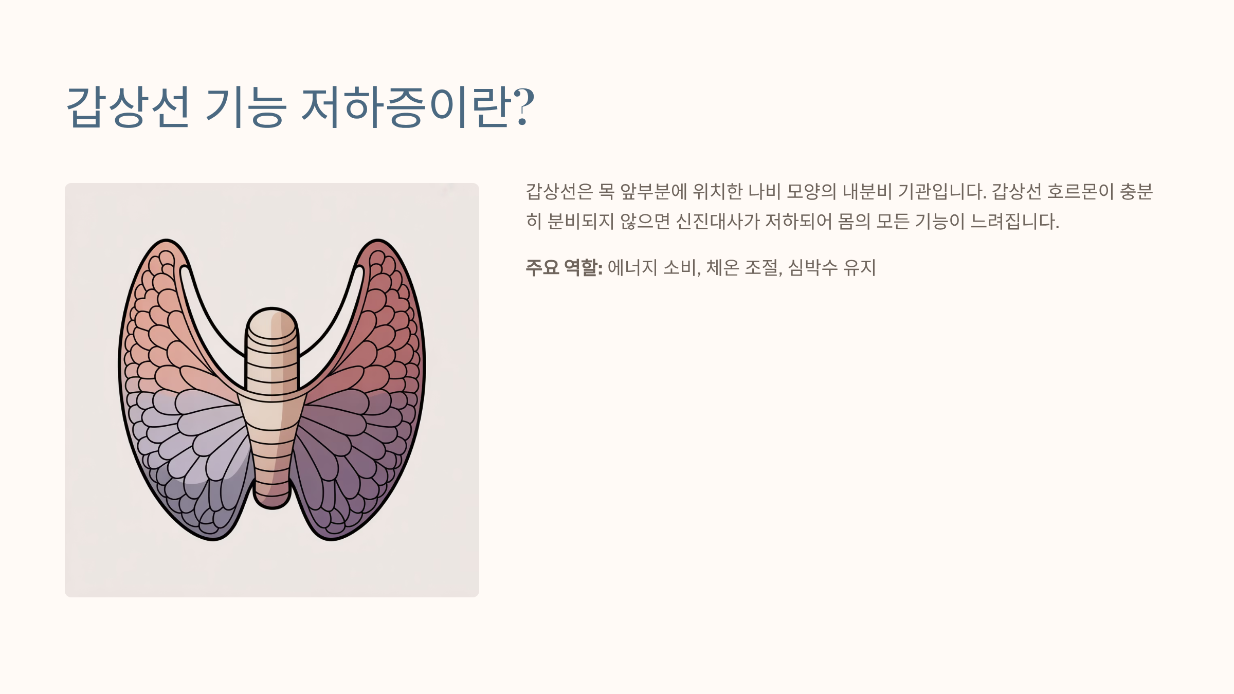 요즘 피곤함이 계속되고, 몸이 붓거나 살이 잘 빠지지 않으신가요? 이런 증상이 있다면 갑상선 기능 저하증을 의심해볼 수 있습니다. 갑상선 기능 저하증은 우리 몸의 대사 속도를 조절하는 갑상선 호르몬이 정상보다 적게 분비되어 몸 전체 기능이 느려지는 질환이에요. 오늘은 갑상선 기능 저하증의 원인, 증상, 진단과 치료, 그리고 일상에서 관리하는 방법까지 하나씩 알려드릴게요.
