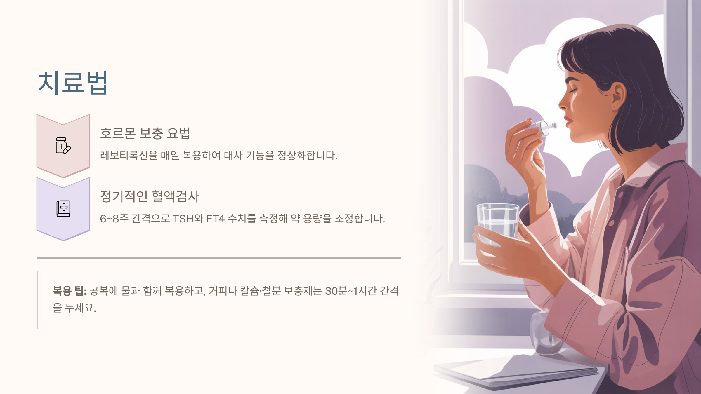 ‘레보티록신(Levothyroxine)’이라는 갑상선 호르몬제를 매일 복용합니다. 이 약은 몸에서 자연적으로 분비되는 호르몬과 동일하게 작용하여 대사 기능을 정상화시킵니다. 꾸준히 복용하면 대부분의 갑상선 기능 저하증 환자는 정상 생활이 가능합니다. - 정기적인 혈액검사