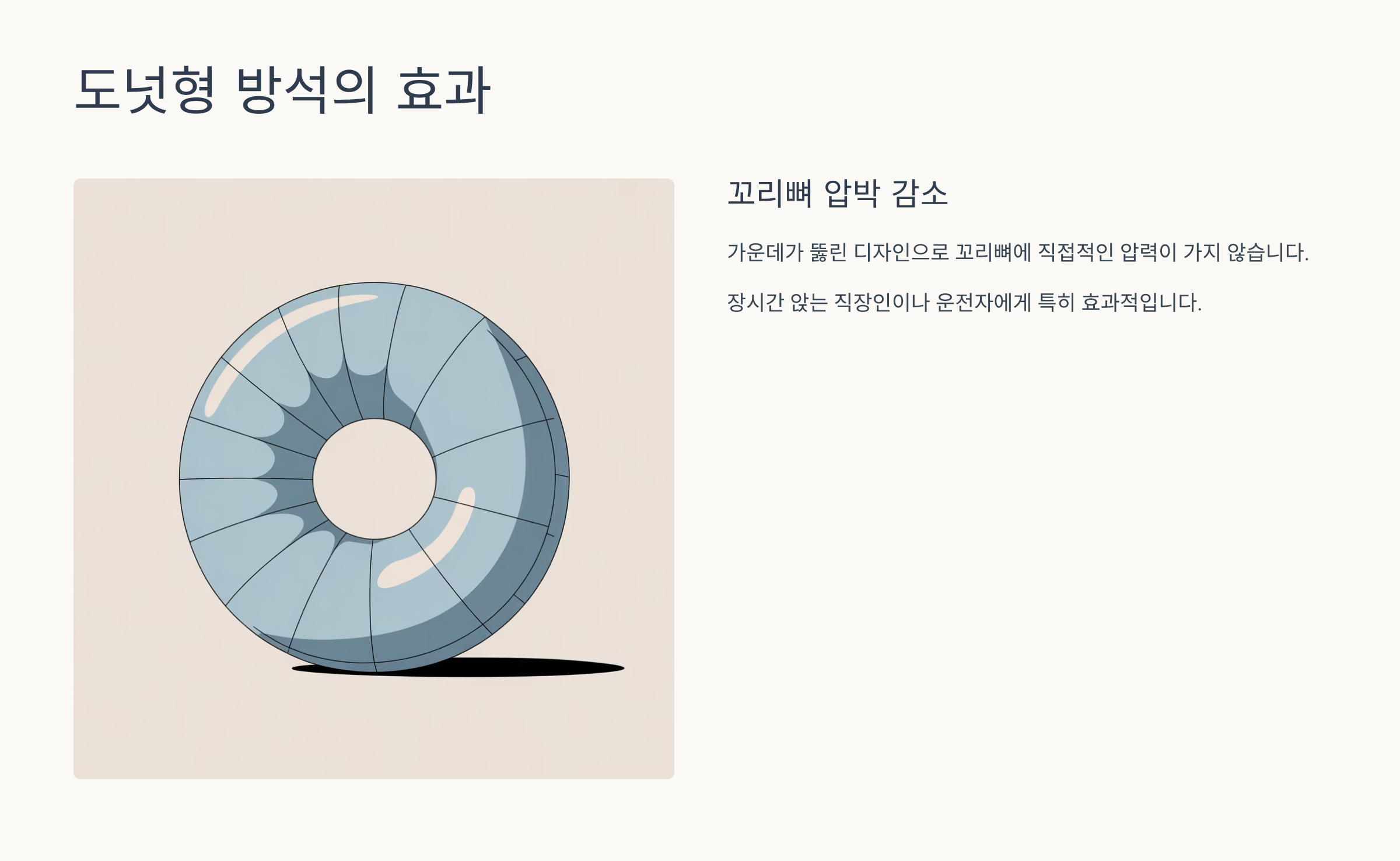 가운데가 뚫린 도넛형 방석은 꼬리뼈에 직접적인 압박을 줄여줍니다. 특히 장시간 앉는 직장인이나 운전자에게 효과적이에요.