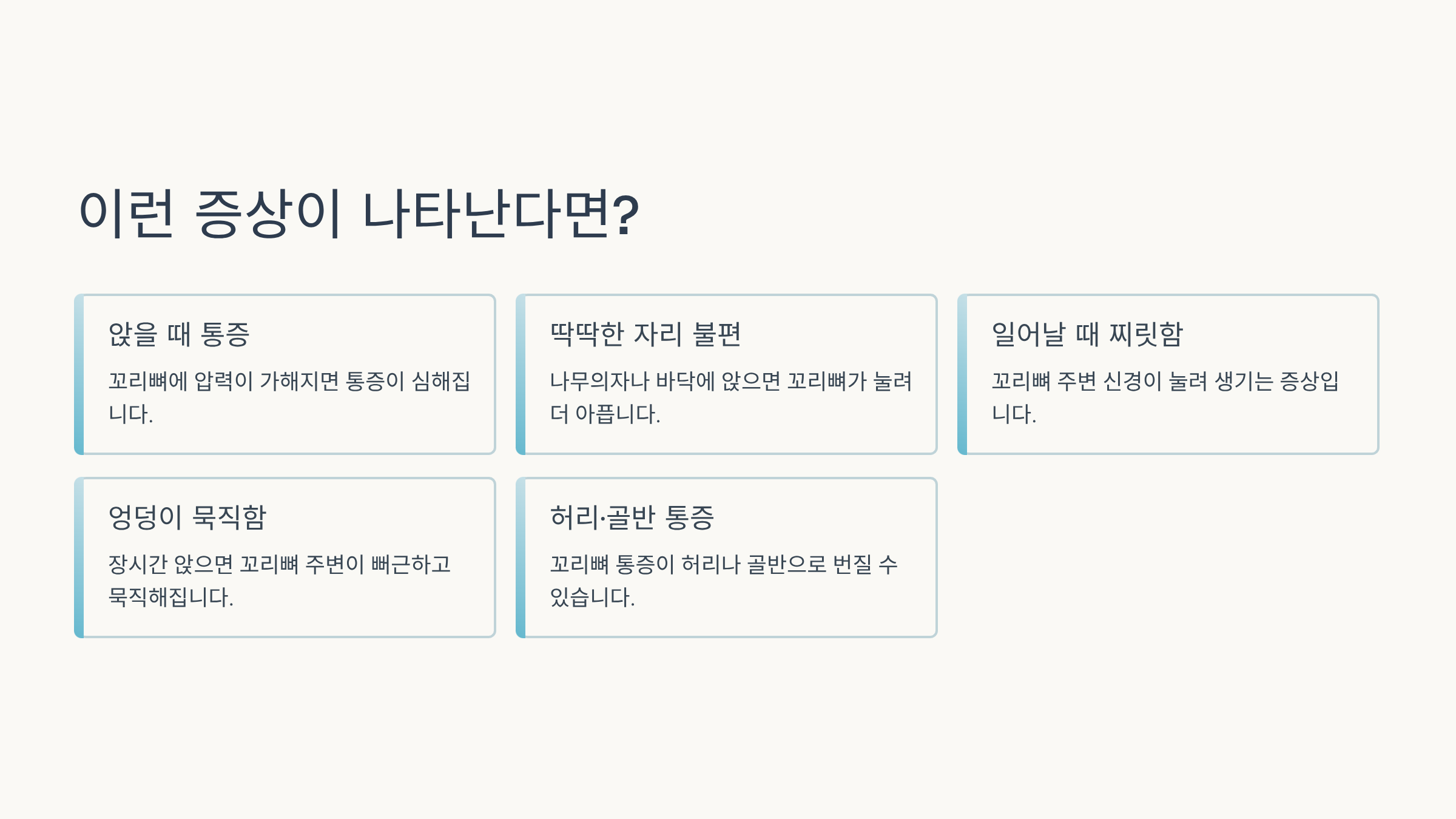 - 앉았다 일어날 때 찌릿한 통증 — 꼬리뼈 주변 신경이 눌려 생기는 증상입니다.