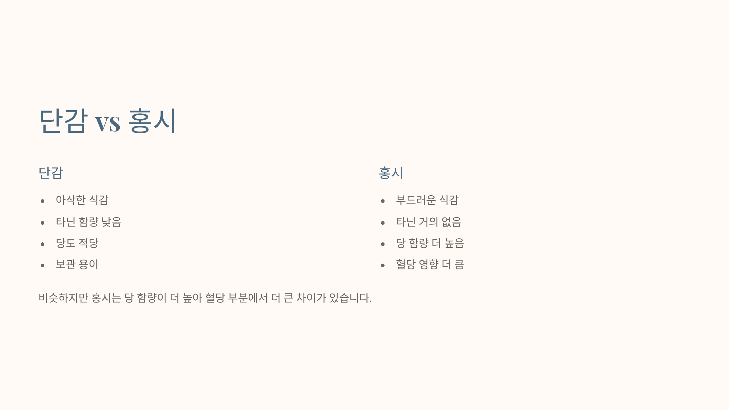 비슷하지만 홍시는 당 함량이 더 높아 단감 효능 부작용 중 혈당 부분이 더 큰 차이가 있어요.