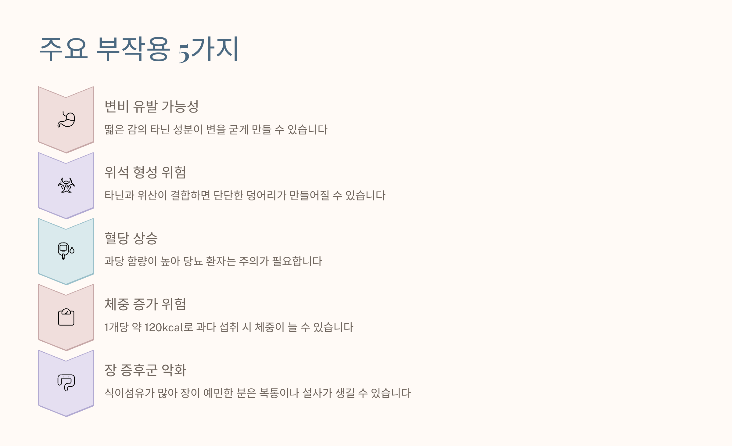 - 단감 효능 부작용 중 부작용: 변비, 위석, 혈당 상승, 체중 증가 등