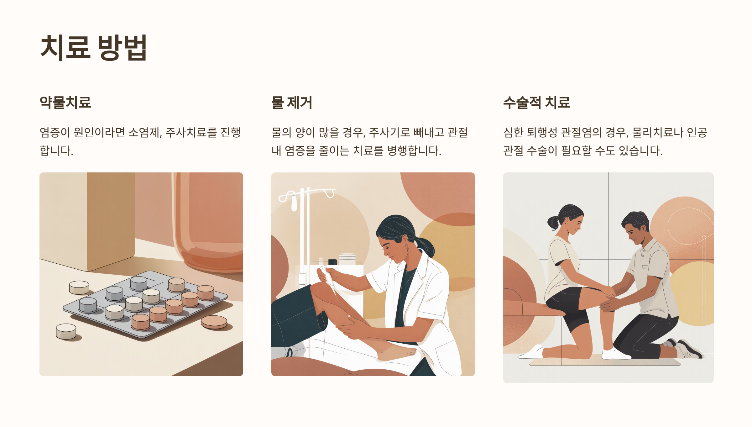 - 물의 양이 많을 경우, 주사기로 빼내고 관절 내 염증을 줄이는 치료를 병행합니다.