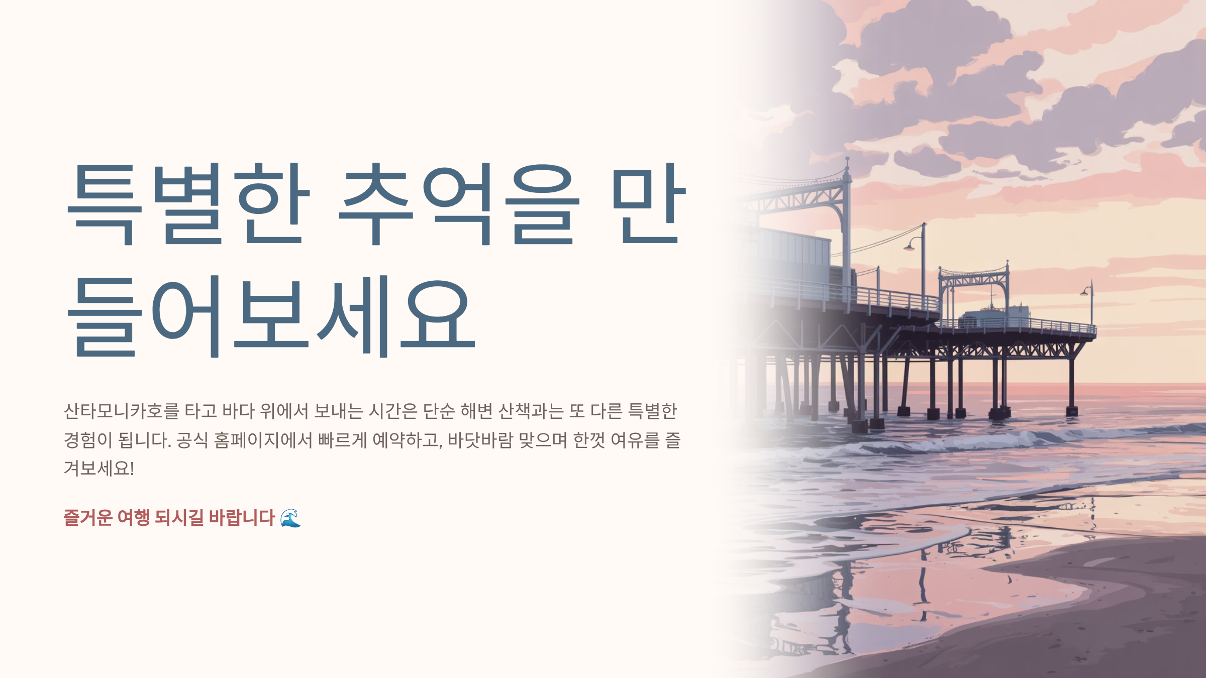 산타모니카호를 타고 바다 위에서 보내는 시간은 단순 해변 산책과는 또 다른 특별한 추억이 됩니다. 공식 홈페이지에서 빠르게 예약하고, 바닷바람 맞으며 한껏 여유를 즐겨보세요! 즐거운 여행 되시길 바랍니다 🌊