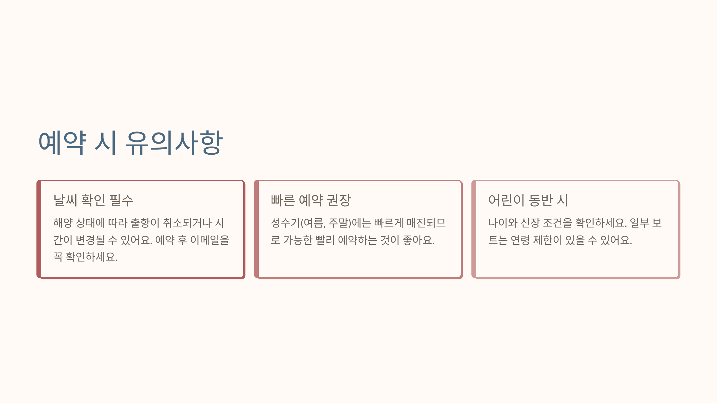 • 성수기·주말은 빠른 예약 권장, 날씨로 인해 일정 변경 가능성 있음.