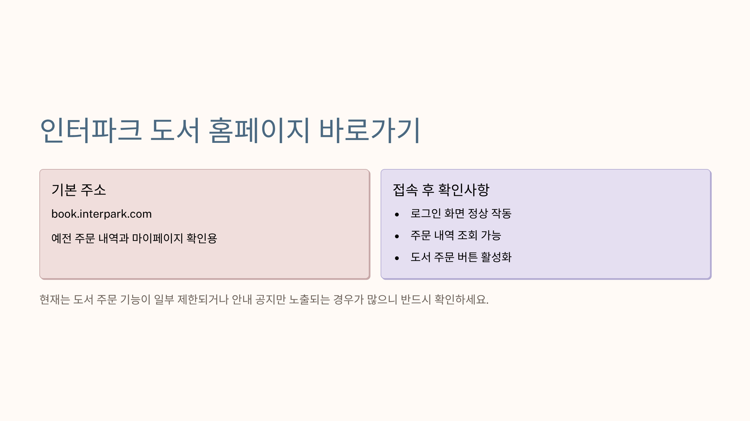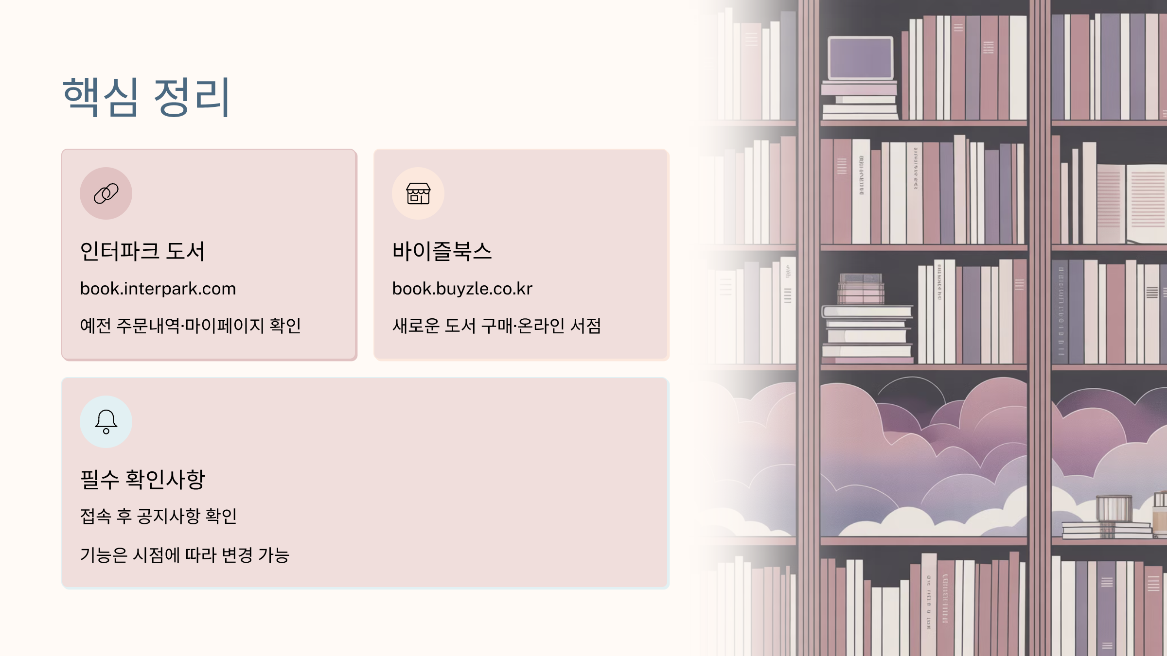 실제 도서 구매 자체는 현재 기준으로는 바이즐북스에서 진행되는 흐름입니다. 그래서 “인터파크 도서 홈페이지 바로가기 → 기존 계정 확인”, “바이즐북스 → 도서 검색·주문” 이렇게 분리해서 쓰는 방식이 가장 깔끔해요.