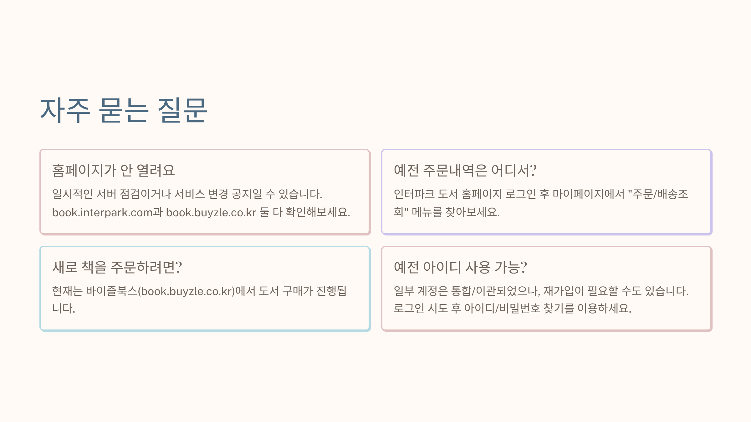 • 예전 주문내역·마이페이지 확인은 인터파크 도서, 새로운 구매는 바이즐북스로 나눠 사용