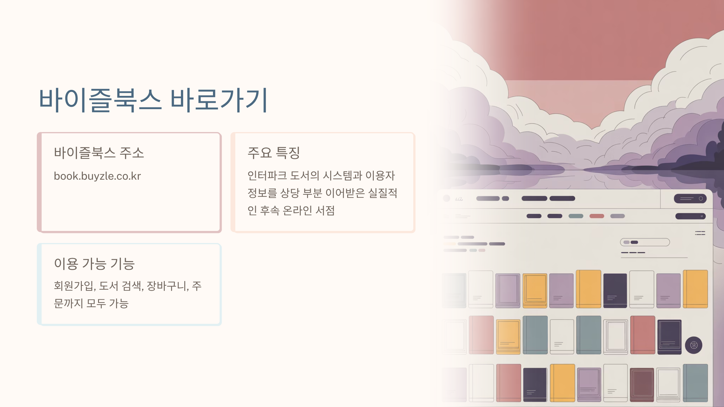 그 대신, 2025년 기준으로는 ‘바이즐북스(BOOK BUYZLE)’라는 이름으로 인터파크 도서의 후속격 온라인 서점이 운영되고 있어요. 그래서 실제로 책을 구매하고 싶을 때는 “인터파크 도서 홈페이지 바로가기” → 기존 페이지 + 바이즐북스 둘 다 체크 이런 식으로 이해하시면 편합니다.