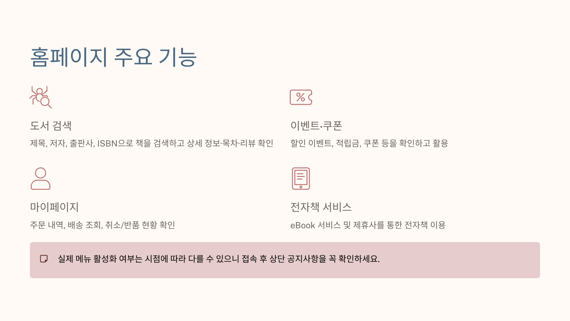 제목, 저자, 출판사, ISBN 등으로 책을 검색하고, 상세 정보·목차·리뷰를 확인할 수 있어요. - 2) 이벤트·쿠폰 확인