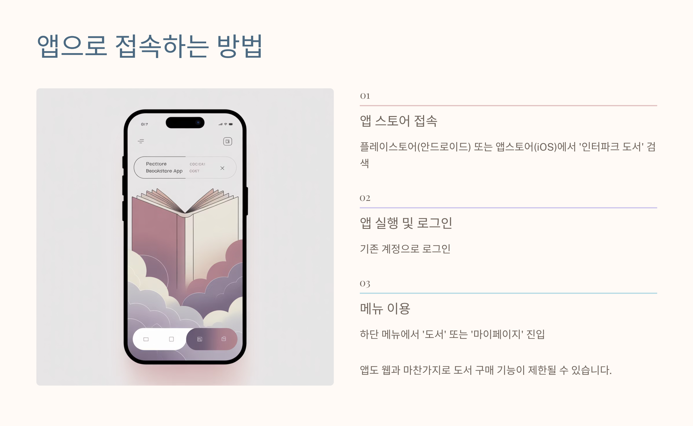 이미 설치되어 있다면 앱 실행 → 로그인 → 하단 메뉴에서 ‘도서’ 또는 ‘마이페이지’ 진입으로 예전 주문내역 확인, 계정 확인 등은 여전히 가능한 경우가 많아요. 다만 앱도 웹과 마찬가지로, 도서 구매 기능이 제한될 수 있다는 점은 꼭 기억해 두셔야 합니다.