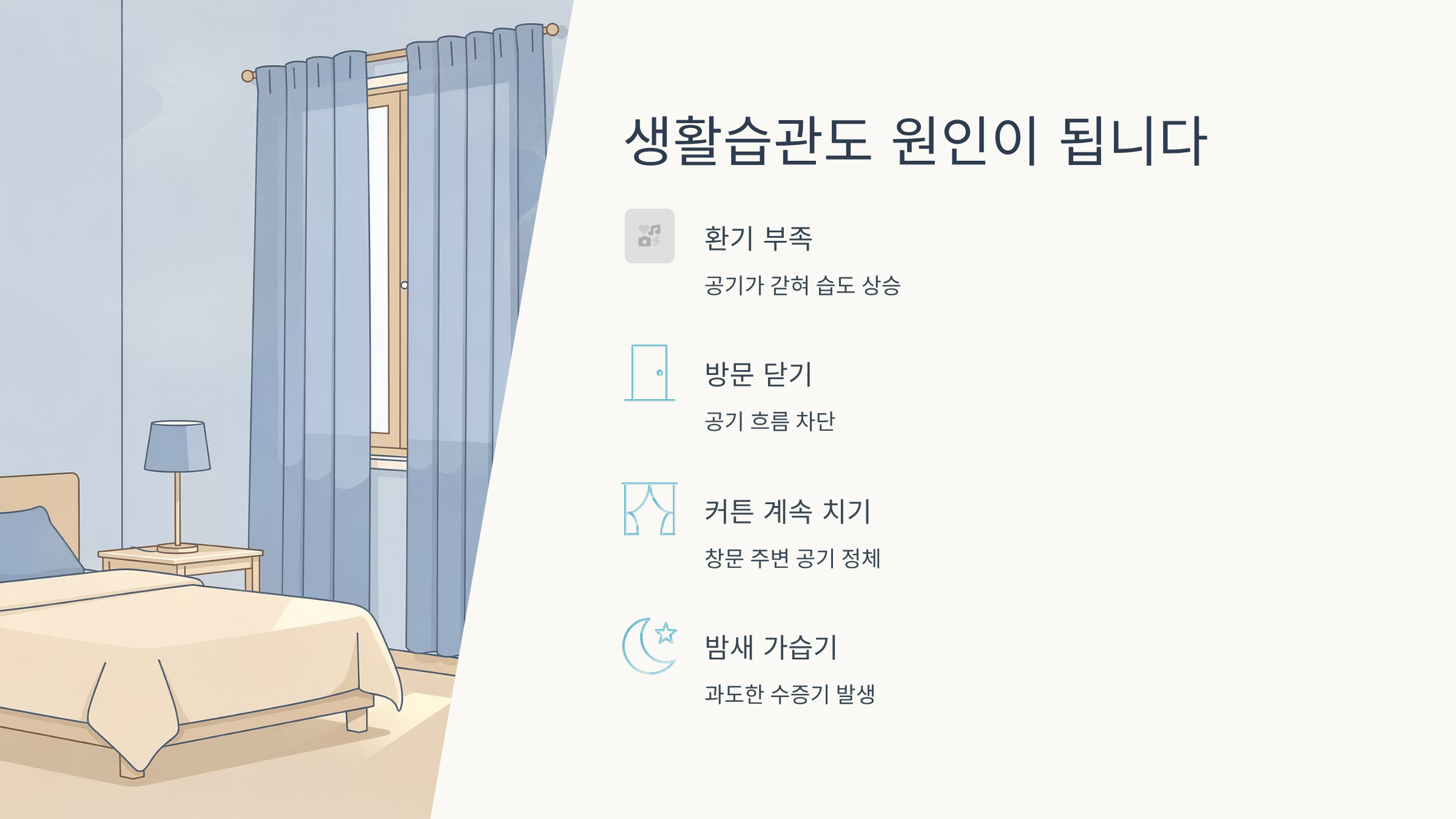 • 커튼을 계속 쳐두어 공기가 정체됨