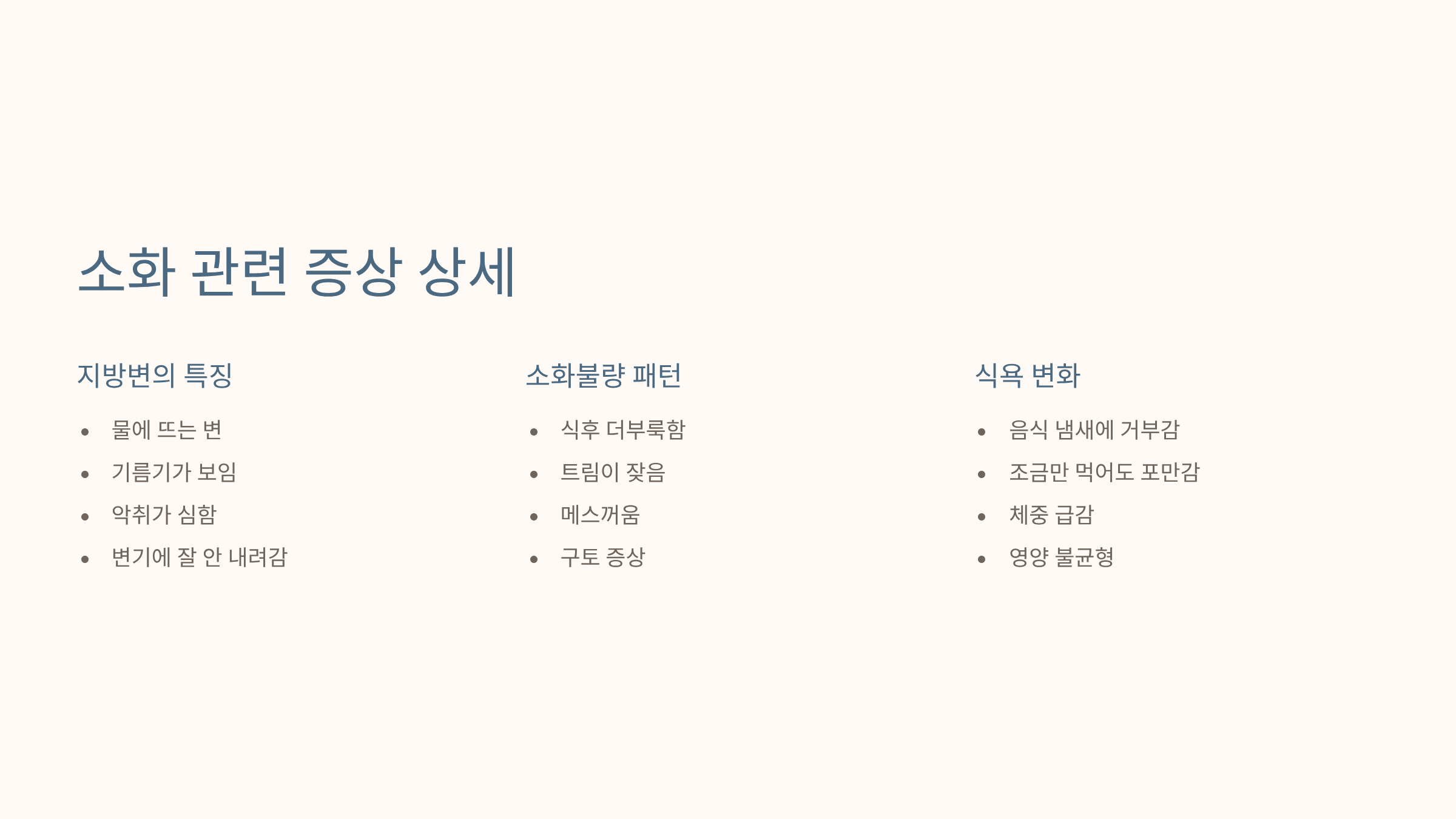 • 등 통증·체중 감소·지속적인 소화불량은 반드시 체크해야 합니다.