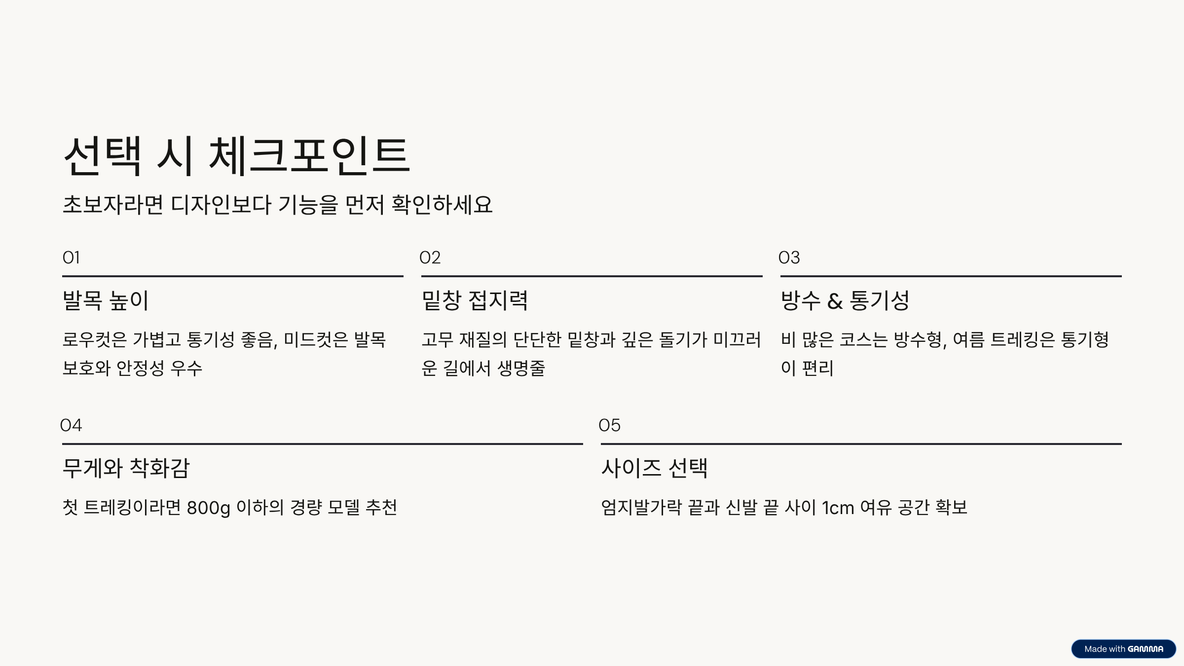 - ① 발목 높이 - 로우컷(발목 아래): 가볍고 통기성이 좋아 초보자나 평지 트레킹용 - 미드컷(발목 덮음): 발목 보호력과 안정성이 높아 산길 초입부터 적응용 - 하이컷: 장거리·암릉 코스용. 처음엔 부담될 수 있어요.