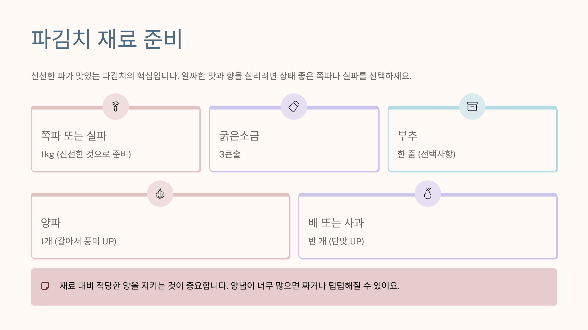- 양념은 과하지 않게, 파의 향을 살리는 비율로