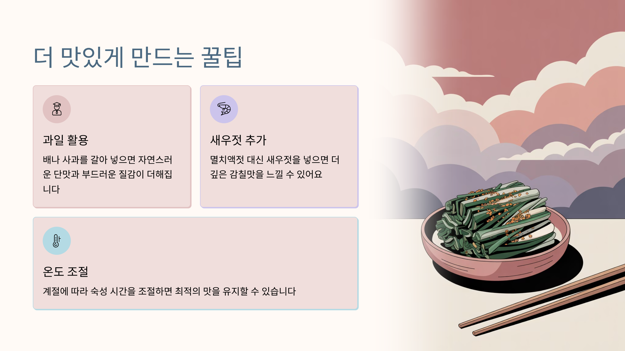 - 그 후 냉장보관 → 하루 지나면 가장 맛있게 익어요