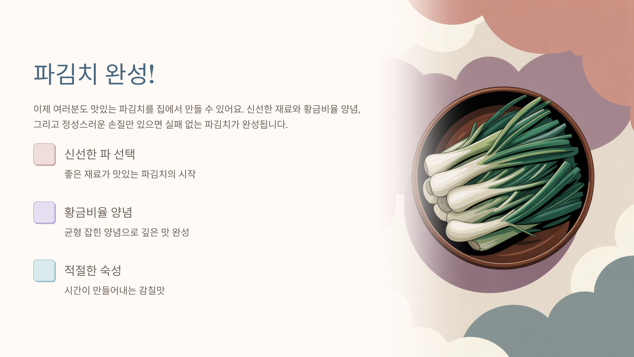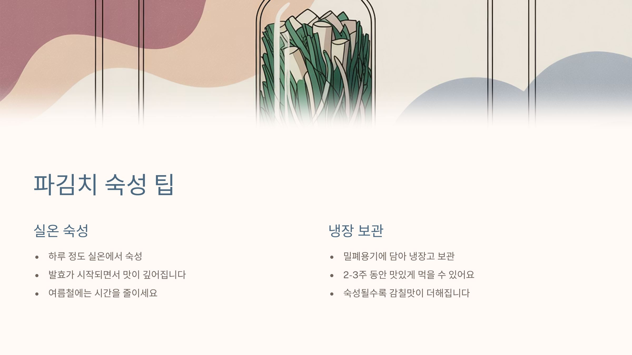 파김치는 배추김치보다 빠르게 익어요. 온도와 보관법에 따라 맛이 완전히 달라집니다.