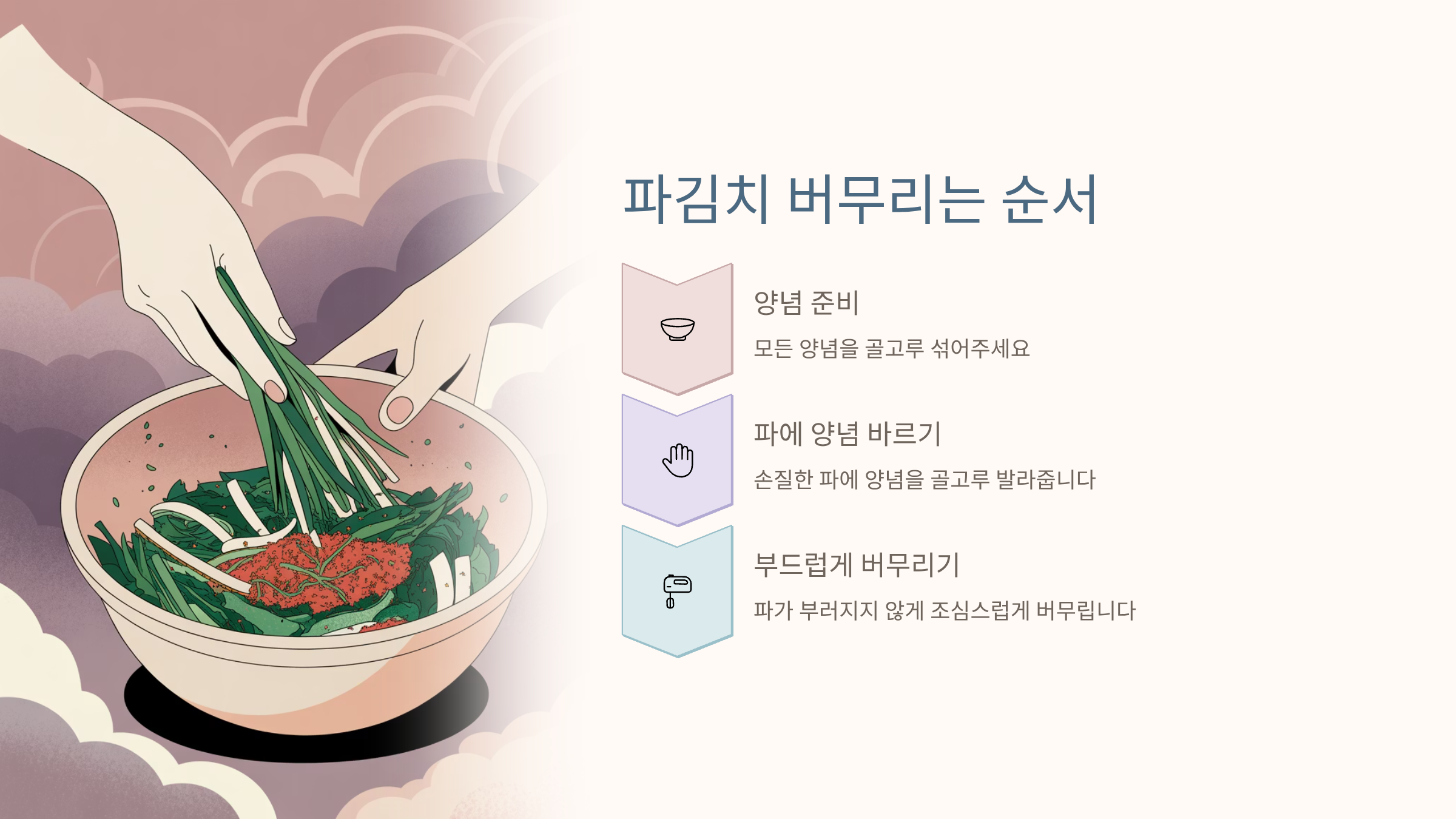 버무릴 때 가장 중요한 건 “힘을 주지 않고 부드럽게”입니다. 파가 눌리지 않아야 아삭한 파김치가 완성돼요.