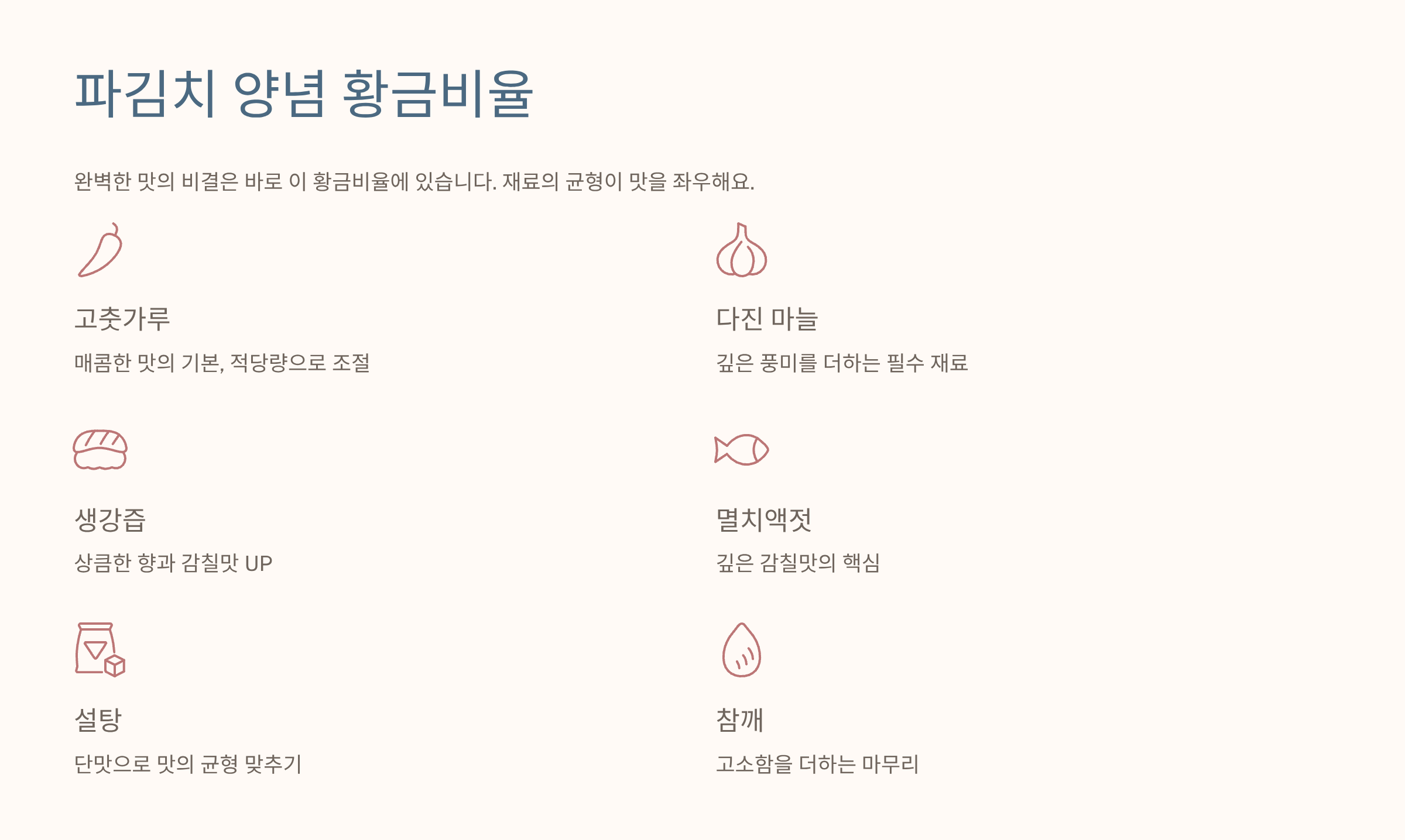 양념 맛이 파김치 전체 맛을 좌우하죠. 아래 비율이면 자극적이지 않고 깊은 맛이 나는 파김치 양념 황금비율이에요.