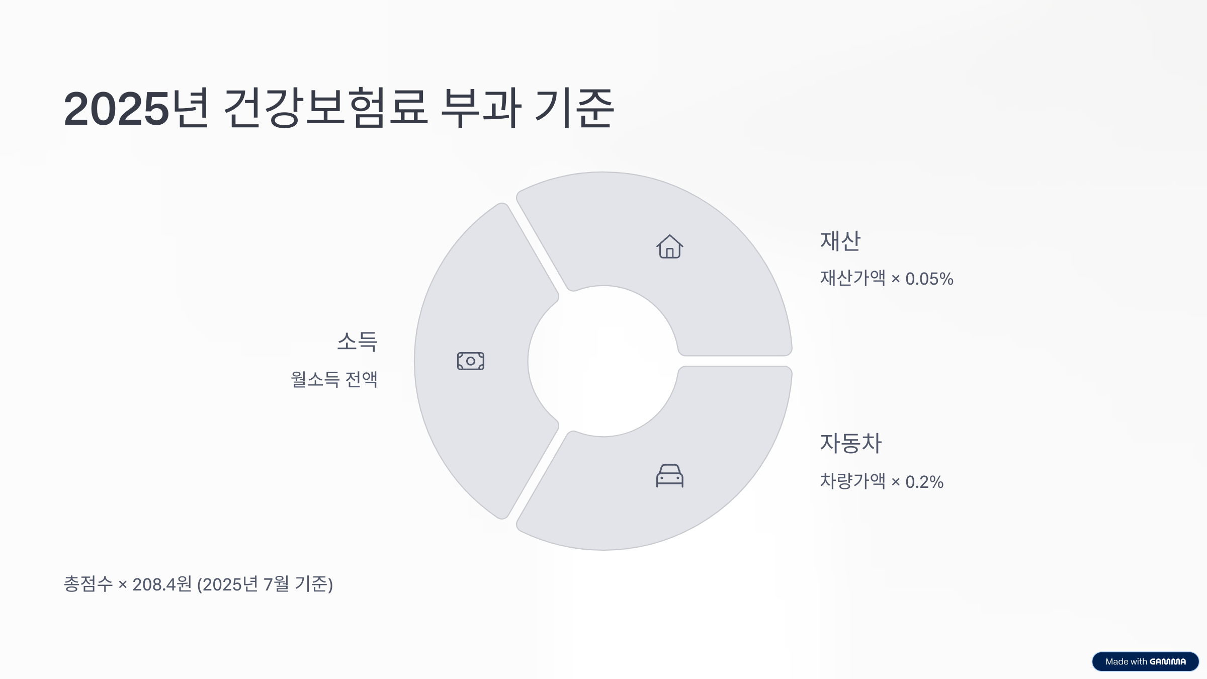 | 합산 후 보험료 산정 | 총점수 × 208.4원(2025년 7월 기준) | ||