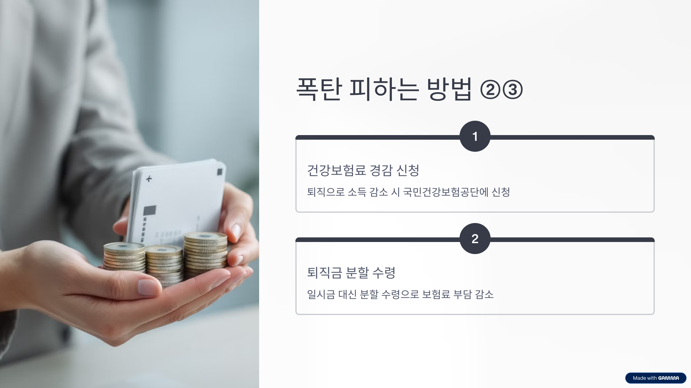 퇴직금을 한 번에 받으면 건강보험료 산정 소득에 포함되어 폭탄이 될 수 있습니다. 가능한 경우 퇴직금을 분할 수령해 보험료 부담을 줄이는 것도 방법입니다.