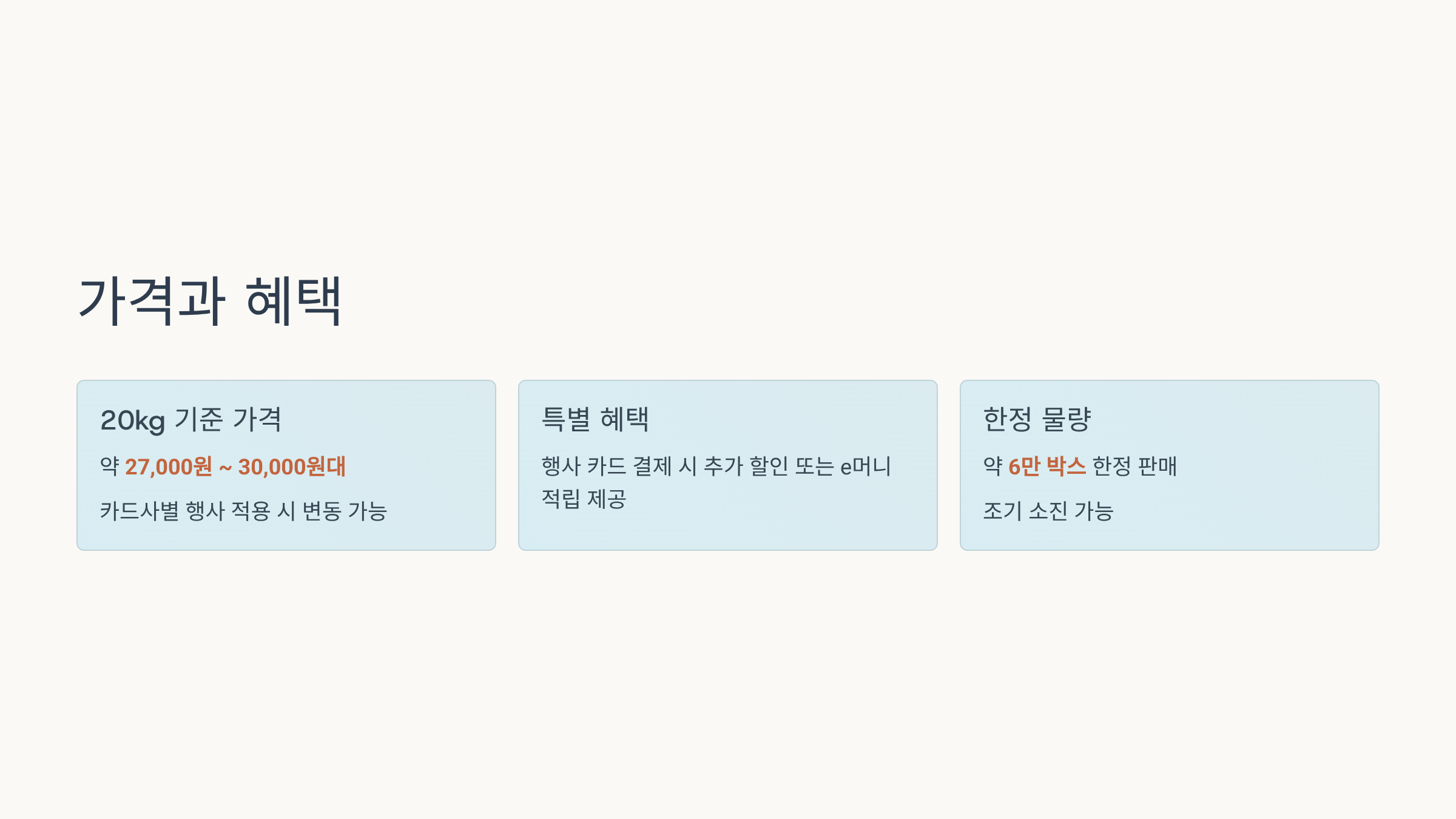 - 20kg 기준 가격: 약 27,000원 ~ 30,000원대 (카드사별 행사 적용 시 변동 가능)
