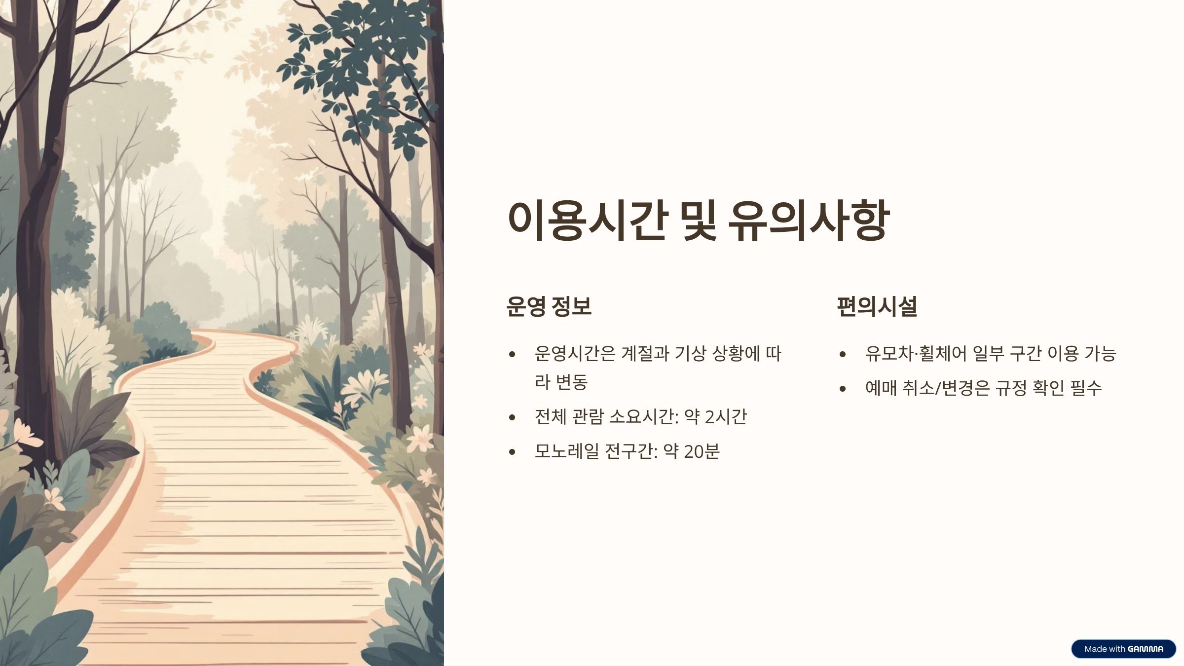 원활한 예매를 위해 아래를 먼저 체크해요. 특히 주말·성수기(벚꽃·단풍 시즌)는 빠르게 매진되니 서두르는 게 좋아요 🍂