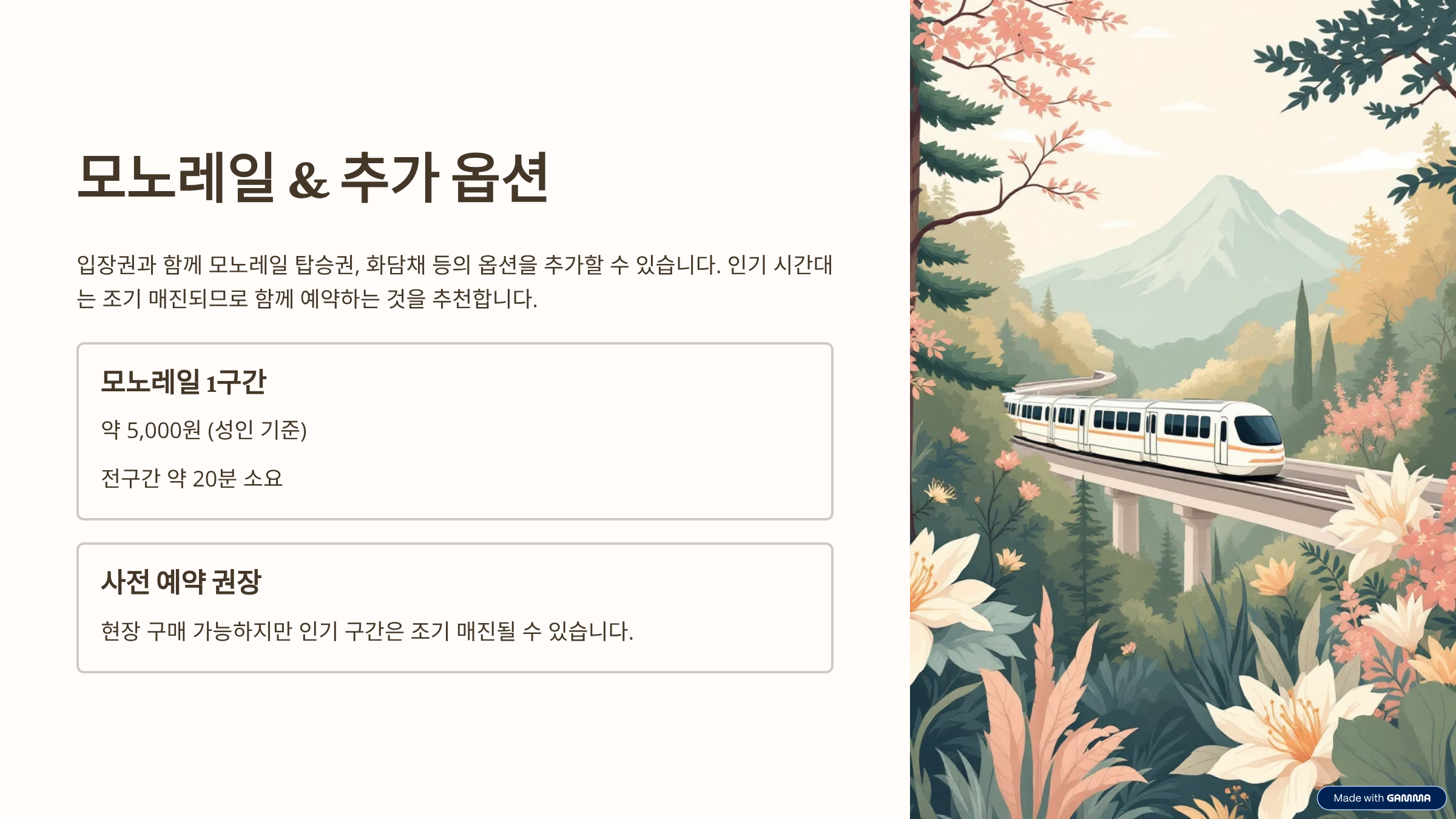 - 전체 관람은 약 2시간 소요, 모노레일 전구간 약 20분